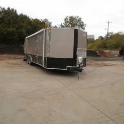 This is a custom enclosed trailer in beige measuring 8.5 ft by 26 ft and features vinyl interior, rubber floor, e-track, generator box and two 5,200 pound axles and brakes.Brands may vary based on stock. Similar specs are used across all brands.